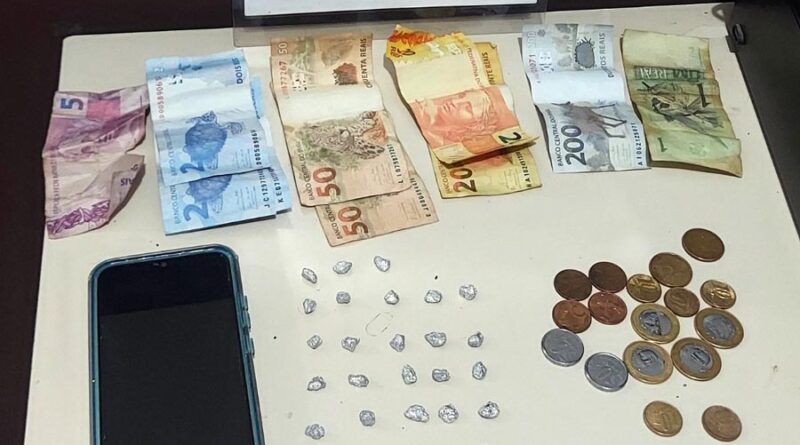 Na busca pessoal, realizada por uma policial feminina, foi encontrada nos bolsos do shorts da acusada a quantia de R$ 358,20 em espécie e um celular. Ao fazer as buscas no terreno onde ele dispensou o objeto, foi encontrado um invólucro de plástico contendo 28 pedras de crack. A droga estava fracionada e embalada para venda.