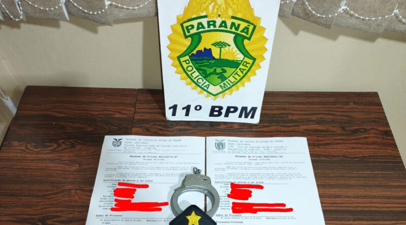 A Polícia Militar (PM) prendeu em Engenheiro Beltrão, na noite desta terça-feira (6), um homem identificado pelas iniciais E. de O. S., com dois mandados de prisão em aberto expedidos pela Justiça da Comarca Londrina. O indivíduo foi detido na Avenida Sete de Setembro.