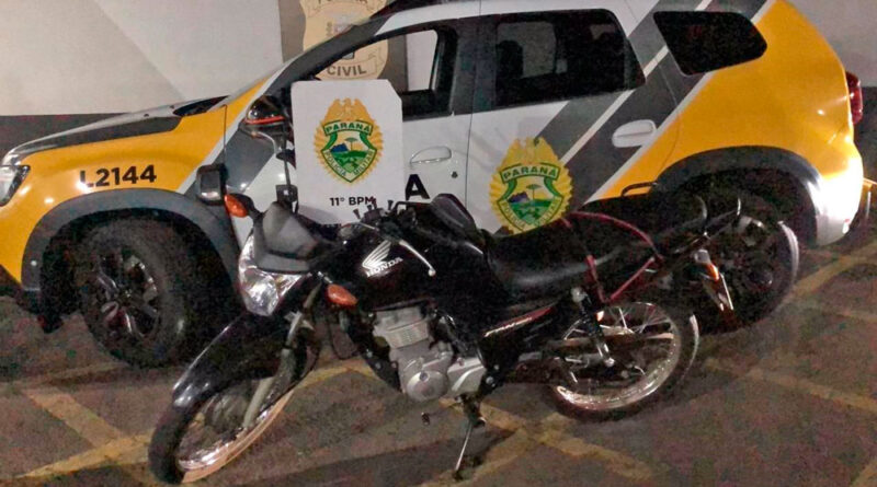 Uma motocicleta furtada foi recuperada pela Polícia Militar (PM) nessa segunda-feira (26), na área central de Campo Mourão. Dois adolescentes, ambos de 15 anos, foram apreendidos após desobedecerem ordem de parada e tentarem fugir da abordagem policial.