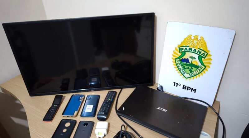 A guarnição coletou informações, analisou vídeos e conseguiu identificar o autor/receptor, de 55 anos, e o indivíduo que adentrou no estabelecimento, de 34 anos. A equipe policial foi ao primeiro endereço e localizou o aparelho televisor no interior da residência, além de um aparelho notebook e três celulares em uma plantação de bananas, que fica na frente da residência.