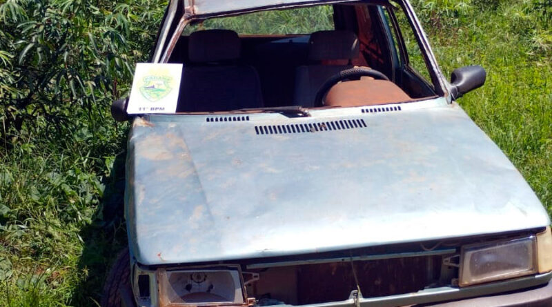 Com as informações, uma equipe policial foi até o local e encontrou um Fiat Uno em visível estado de abandono e má conservação. O carro estava com a porta aberta, sem para-brisa e com diversos danos estruturais.
