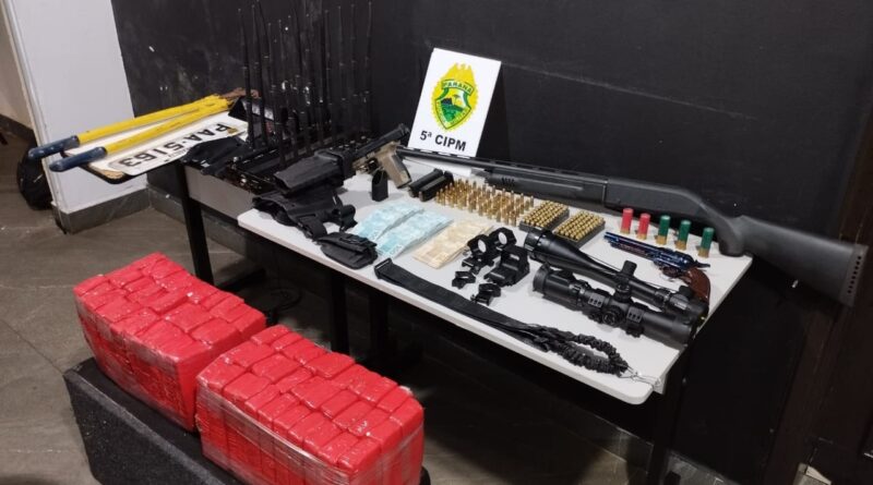 Com base nas informações, as equipes deslocaram ao local. Após buscas encontraram dois fardos com 33 tabletes de maconha pesando cerca de 31,5 quilos, uma espingarda semi automática carregada e municiada, e uma pistola carregada e municiada.