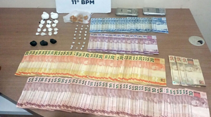 Foram encontradas 14 buchas de cocaína, mais 17 pedras de crack, além de uma porção maior da droga sem embalagem, 3 porções de maconha, e R$ 1.640,00 em espécie em notas de R$ 2,00; R$ 5,00; R$10,00; R$ 20,00; e 50,00, dinheiro característico do tráfico de drogas.