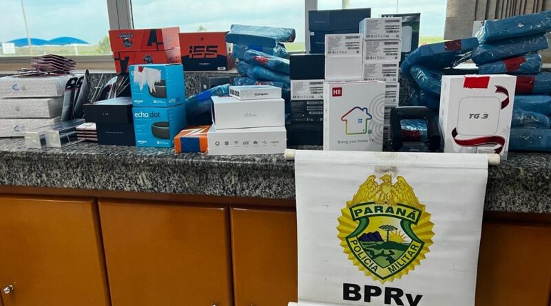 Entre os produtos estavam receptores de TV, aparelhos celulares iPhone, pendrives, componentes eletrônicos para computadores, entre outros. De acordo com a polícia, os produtos estavam em um veículo GM ÔNIX, com placas de Minas Gerais.