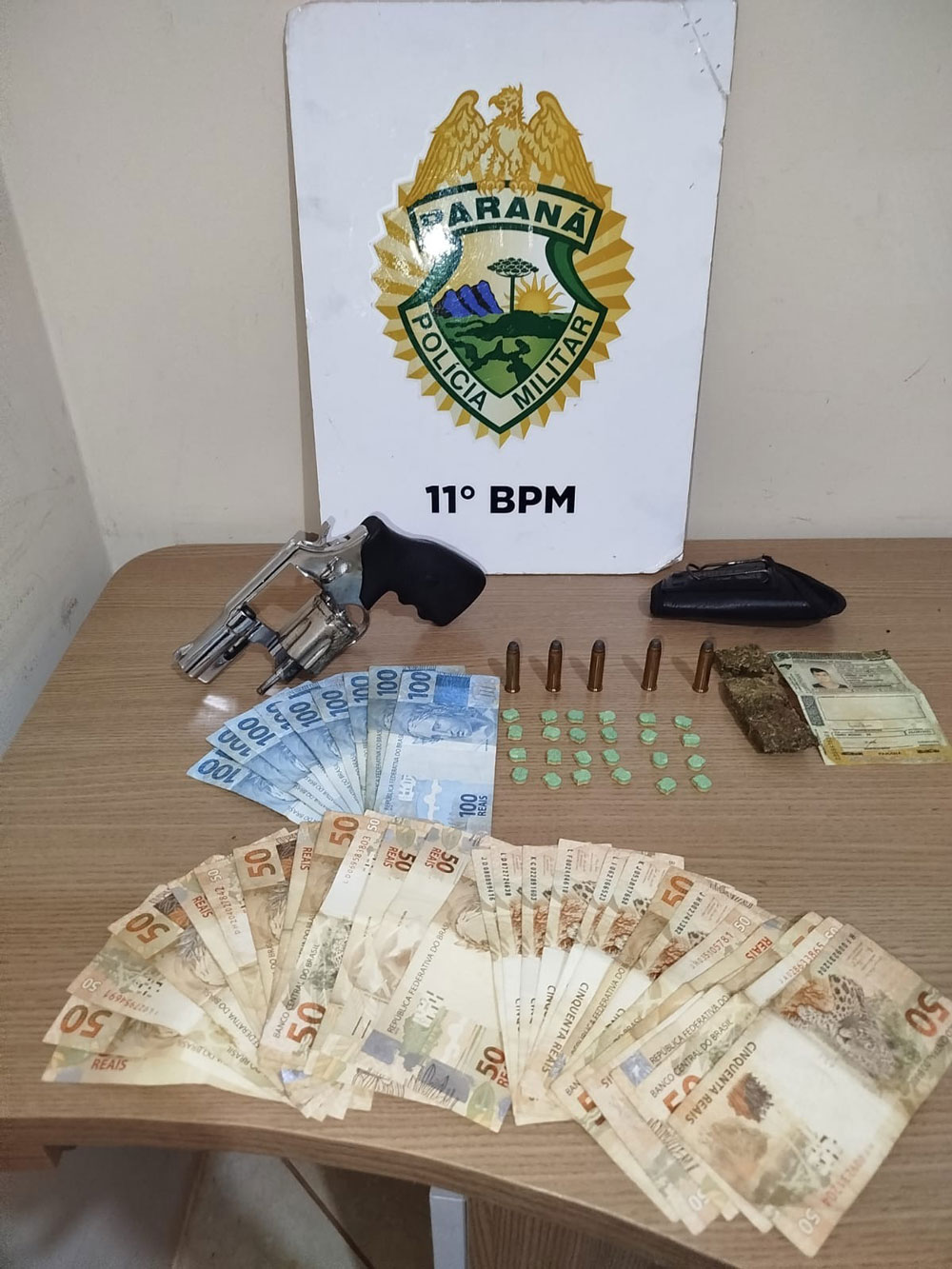 Pouco tempo depois, às 23h05, os militares foram acionados para atender a uma ocorrência de perturbação do sossego em uma chácara na área rural de Campo Mourão. No local, foi constatado som alto em um veículo. Durante a abordagem, um homem tentou se esconder na edícula e ocultar um objeto atrás de uma churrasqueira. A equipe encontrou 24 comprimidos de ecstasy, além de R$ 2.300,00 e a chave de um veículo estacionado.