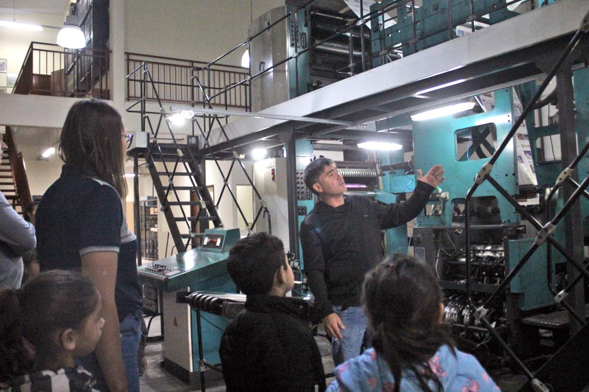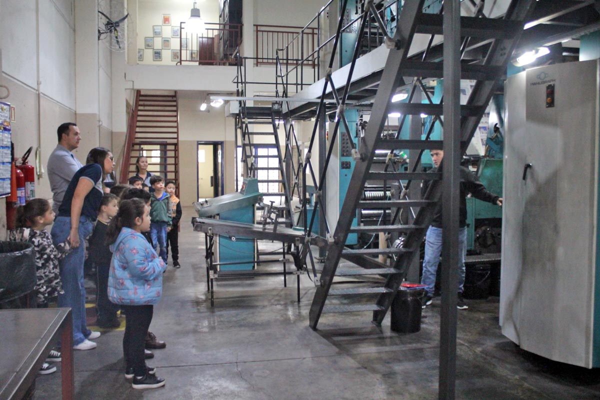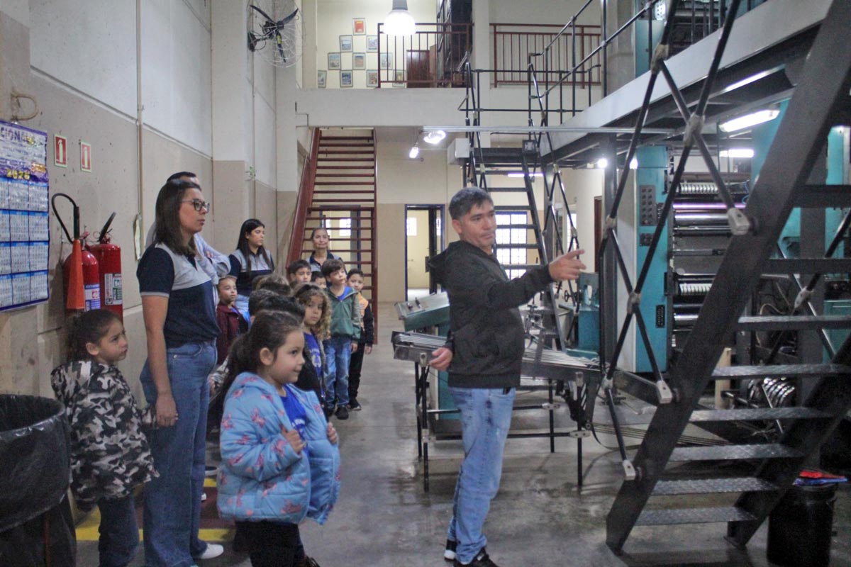 Para os alunos, o momento mais encantador e divertido foi ver, ao vivo, o jornal ganhando forma. A equipe da gráfica explicou o funcionamento da máquina, permitindo que todos acompanhassem de perto o processo de produção das páginas.