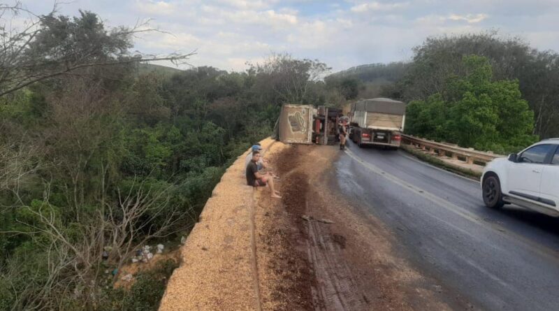 Uma carreta bitrem carregada com uma carga de mais de 50 toneladas de milho a granel tombou na tarde dessa terça-feira (20), na rodovia PR-487, entre Luiziana e Iretama. O tombamento aconteceu na “ponte torta”, local já bastante conhecido pela ocorrência frequente de acidentes. O condutor do veículo, um homem de 53 anos, ficou ferido.