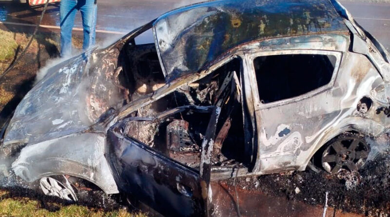 Carro pega fogo após capotar e jovem fica ferida