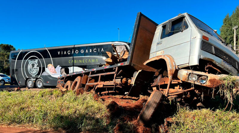 A batida aconteceu nesta quinta-feira (30), na rodovia BR-277, km 577,9, sentido Cascavel. As informações são da Polícia Rodoviária Federal (PRF). De acordo com a (PRF), o caminhão com toras estava transitando pelo acostamento na rodovia, sentido Cascavel, quando entrou de uma vez na pista de rolamento na frente do ônibus, sendo atingido na traseira.