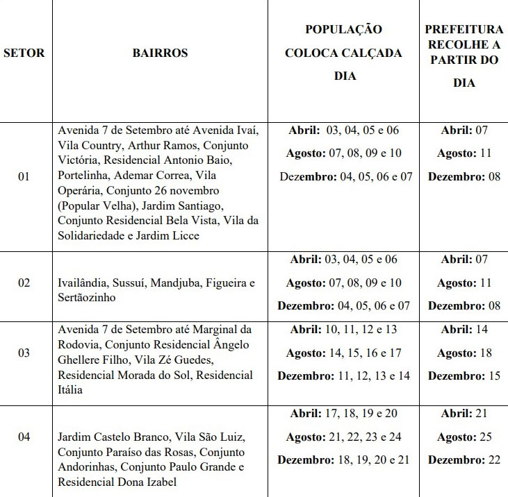 A secretaria reforça que a prática configura infração ambiental e pode resultar em penalidades previstas na legislação vigente. Em caso de dúvidas ou necessidade de orientação específica, o município recomenda que os moradores entrem em contato diretamente com a Secretaria de Meio Ambiente. Confira abaixo o cronograma de coleta de resíduos pela prefeitura.