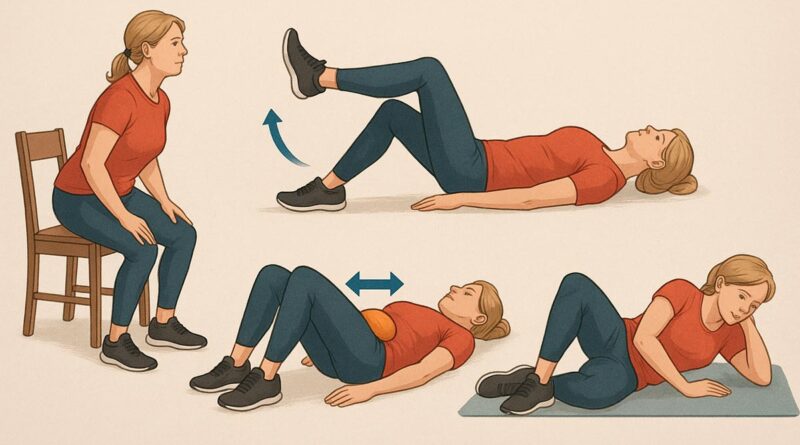 - Apertar Bola Entre os Joelhos: Deitado de costas com os joelhos dobrados, coloque uma bola macia ou uma almofada dobrada entre eles. Aperte a bola por 5 segundos e relaxe. Fortalece a parte interna das coxas.