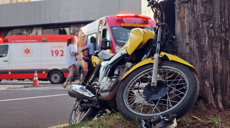 Motociclista atropela pedestre na faixa, perde o controle da moto e bate em árvore