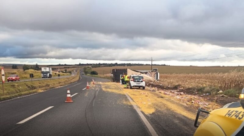 Tombamento aconteceu próximo ao distrito de Sertãozinho, pertencente a Engenheiro Beltrão. Carga de grão ficou espalhada pelo local.
