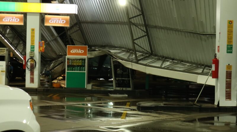 Com ventos fortes de 72,4 km/h, cobertura de posto de combustível desaba em Campo Mourão
